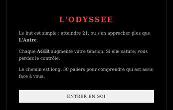 Palier est un jeu narratif introspectif où chaque niveau représente une étape psychologique à franchir. Explore tes émotions, fais des choix déterminants et gravis les paliers de ton propre esprit pour avancer.